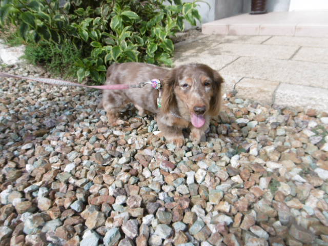 朝のお散歩では少し眩しそうにしながらも
